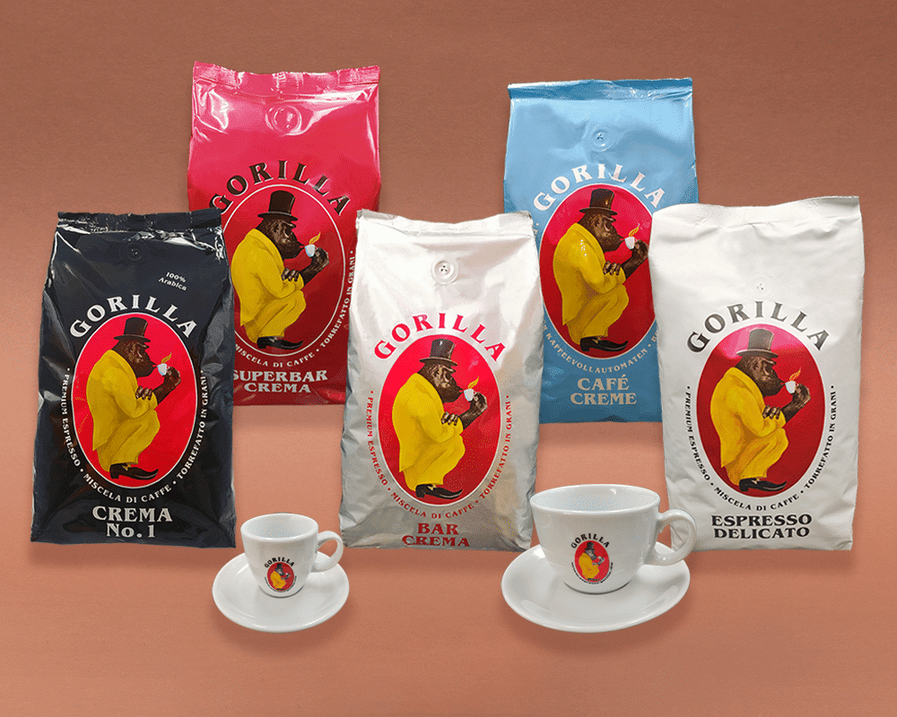 Profitieren Sie von dem günstigen Gorilla Starter- und Probierset bestehend aus jeweils 1KG ganze Bohnen Gorilla SUPER BAR Crema, BAR Crema, Café Creme, Espresso Delicato und Crema No. 1. Dazu erhalten Sie eine Gorilla Espresso und eine Gorilla Cappuccino Tasse.