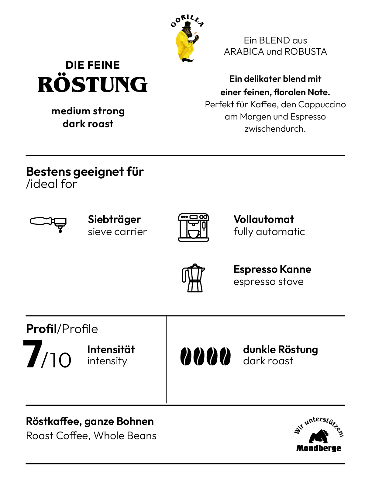 Der Gorilla Espresso Delicato ist ein Spitzen Espresso aus besten südamerikanischen Arabicabohnen und hochwertigen Robusta. Diese etwas dunklere Röstung schafft so ein Geschmackserlebnis nach norditalienischem Vorbild. Der Espresso Delicato hat ein mittelstarkes Aroma bei mittleren Koffeingehalt. Gorilla benutzt nur beste Rohkaffees die aus Hochlandgewächsen gewonnenen werden.