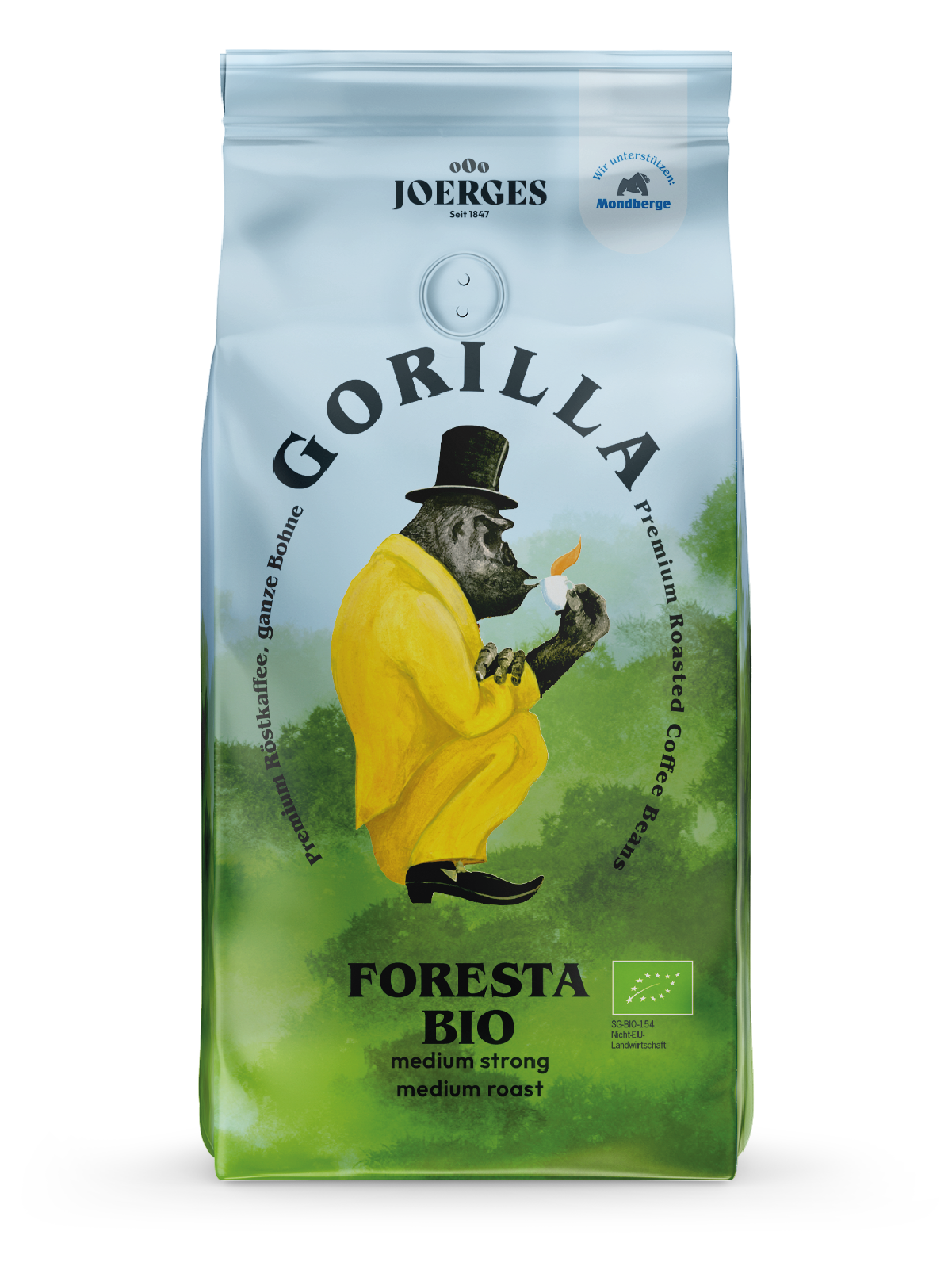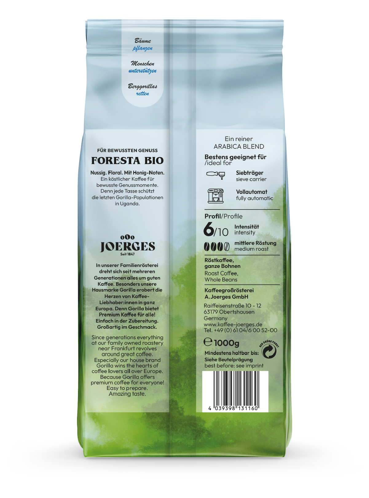 Die Gorilla Foresta Kaffekreation besteht zu 100% aus BIO Arabicabohnen, die aus Afrika, Südamerika und Indien stammen. Mit dem Kauf des Gorilla Foresta unterstützen Sie die Hilfsprojekte der EFICO Foundation und das Projekt Mondberge. Gorilla Kaffee Joerges unterstützt diese beiden Projekte, die sich den Lebensbedingungen und Entwicklungen der Kaffeebauern, dem Schutze der Gorillas und dem Erhalt der Natur widmen.