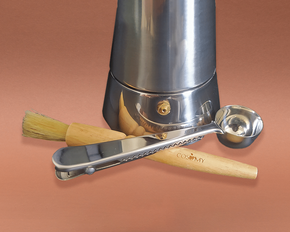 Das Paket enthält ein 6-Tassen-Kaffeemaschinen-Set, einen Messlöffel und eine Reinigungsbürste